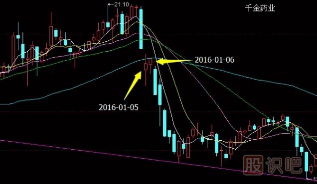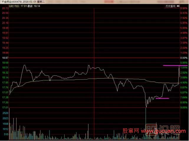 具體來(lái)看看當(dāng)天的K線圖。上圖是千金藥業(yè)的走勢(shì),下圖是上證指數(shù)的走勢(shì)。個(gè)股明顯的弱于大盤。