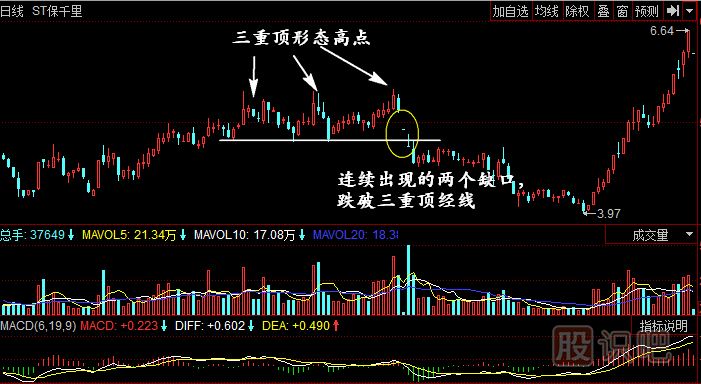 如圖所示:st保千里的日K線中,股價(jià)短時(shí)間內(nèi)的跳空下跌兩個(gè)缺口造就了該股的頂部三重頂被跌破的形態(tài)。投資者減倉(cāng)出貨的重要時(shí)機(jī)也正在此處。今后股價(jià)持續(xù)回落的過(guò)程中,前期的三重頂形態(tài)起到了非常重要的作用。