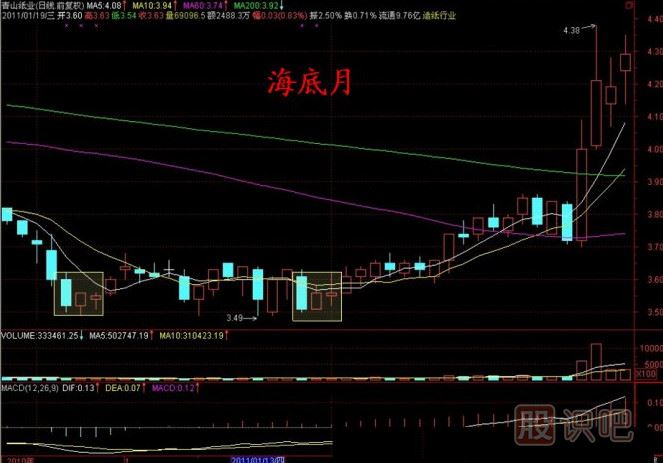 二、海底月:它的具體要求是第一天收中陰線或者大陰線,第二、第三天收上升形態(tài)的小陽或十字星,并且三天中有成交量放大趨勢的跡象。大陰線好比是一只大船沉入海底,但在底部受到強大的支撐,并有超過其下跌的能量維持它的上升,因此假如說均線系統(tǒng)是往上的,中線指標看好,沒有理由認為該大陰線是行情的中止,應該考慮這是主力刻意打壓造成的,因此出現這種情況可以認為是新一輪行情的旭日東升。大陰轉小連陽。