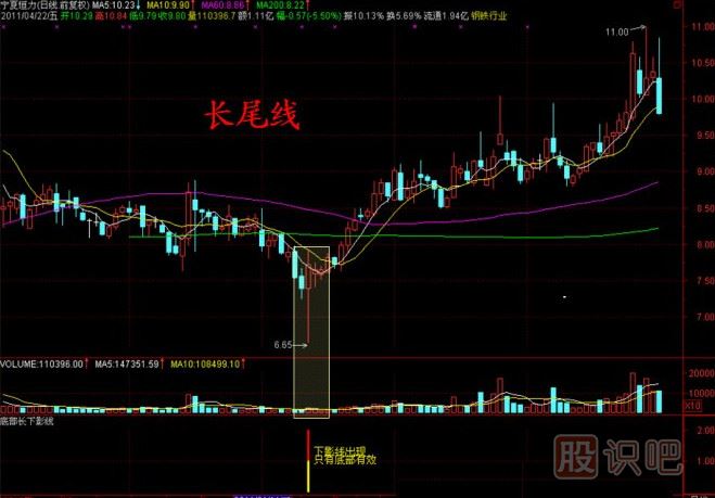 七、長尾線:當天開盤之后,股市出現放量下跌,但之后莫名其妙被多頭主力拉升,留下了一個長長的下影線,這是做反彈資金介入的信號,只要第二天重拾上升路,上升空間就很明顯。底部是由形態(tài)構造的,但成交量起了一個關鍵性的作用,無論是縮量也好、放量也好,都必須要有個規(guī)律,比如說逐波縮量、溫和放量這都是一種向好量變過程,但假如說有放量不規(guī)則、或者說上去的時候成交量很大但沒有漲多少,無論任何形態(tài)都有成為下跌換檔的可能。底部長下影線。