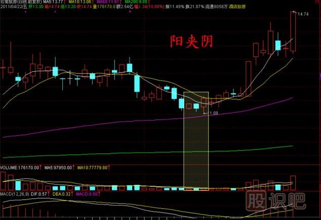 三、陽夾陰:即二根陽線中間夾一根陰線,意思是說第一天股票上揚受到抑制,第二天被迫調整,但第三天新生力量又重新介入,因此這種上升就比較可靠,后市向好的機會多。兩陽夾一陰,多方炮。