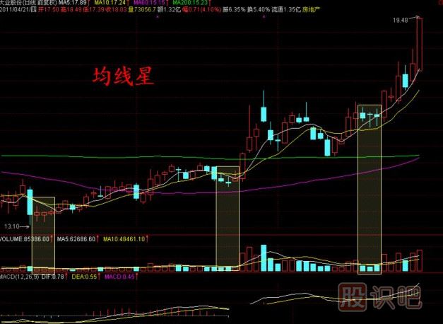 四、均線星:在底部均線系統(tǒng)剛修復往上的時候,往往會在均線附近收一個陰或者陽十字星,這是多空力量平衡的一種表示,但發(fā)生在底部,第二天極容易出現反彈或者往上突破,這是一種不引人注目的形態(tài)。底部均線十字星。