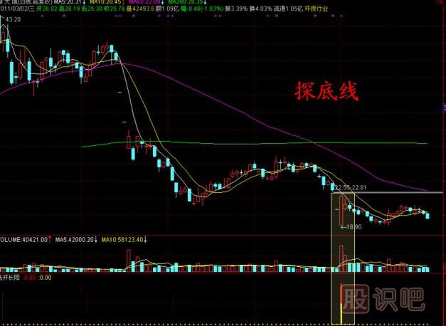 六、探底線:當天開盤低開在均線的下方,而收盤在均線的上方,這是主力為了進一步做行情而刻意做出來,按照慣性原理后市理應看漲。低開大陽。