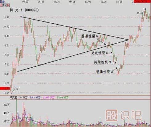 裂口可分為普通性裂口、突破性裂口,持續(xù)性裂口和衰竭性裂口四種。其中,普通性裂口發(fā)生在市場(交易標(biāo)的的價格)所形成的形態(tài)之內(nèi),一般沒有具體指導(dǎo)交易方向的特別意義,所以也就無須勞心費(fèi)神的去分析研究它了。