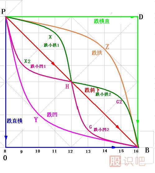 1、基本跌勢從P下跌到Z,再下跌到B,由于是拱形,稱為“跌拱”線。