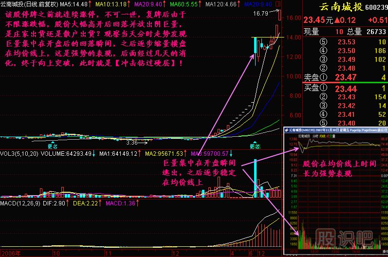 股價在連續(xù)的暴漲后也會遇到壓力,這個時候往往放出巨量,有時候還是陰巨量,這就像沖擊鉆遇到硬層一樣,這個時候要觀察分時走勢,如果走勢基本強勁的,說明主力并沒有出貨,其實你從側(cè)面想想也知道,突然漲那么高,散戶看到放出巨量,一定怕得要命,早就在震蕩中出逃了,主力是不可能在當(dāng)日出逃的,沒人有這個膽量來這么高的地方接盤,所以只能是散戶在出逃,而主力在吸納護盤,主力要出貨只有華山一條路——漲!而一旦股價橫盤完畢向上突破瞬間,就是沖擊鉆過硬層,股價還有慣性上升,投資者可抓緊機會買入!