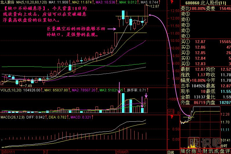 小結(jié):快速買進(jìn)當(dāng)天漲停板技術(shù)的訣竅就是巨量跳空過平臺,回檔不補(bǔ)缺口再度放量拉起過前頭打進(jìn)!簡潔點說就是巨量跳空,回檔買進(jìn)!這八個金光閃閃的大字一定要牢記心頭!
