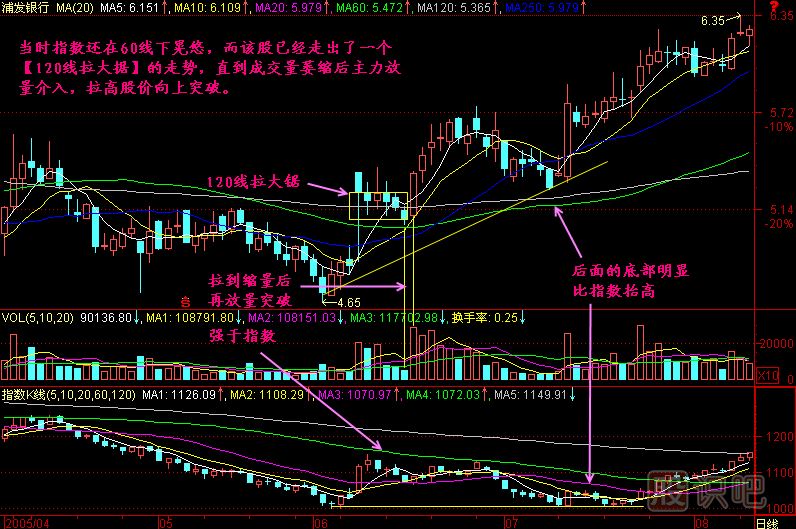 第一個(gè)原因是要有一定時(shí)間,第二個(gè)原因要往下砸盤,第三個(gè)原因是要往上拉,這樣就形成了圍繞120線的一個(gè)爭奪。爭奪的位置為什么會恰恰好在120線上下呢?這只是一個(gè)巧合。一般情況下,我們把一個(gè)月作為20個(gè)交易日,120個(gè)交易日就是半年的時(shí)間,半年的平均成本都在這里,所以最容易在這一帶形成拉大據(jù)。當(dāng)然在爭奪120線也是一個(gè)習(xí)慣,拉大鋸位置有時(shí)候也會拉偏,如果拉大鋸是在120線的上方,那就是強(qiáng)勢拉大據(jù),叫120上拉大鋸,位置往下一點(diǎn),就叫120下拉大鋸,走勢相對弱一點(diǎn)。
