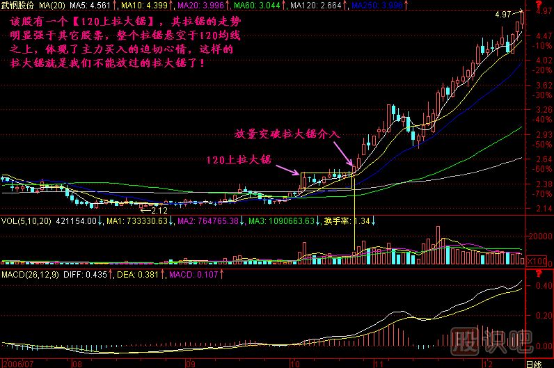 從強(qiáng)弱度來說,我們最看好的是120上拉大鋸,因?yàn)樗砹酥髁I入的迫切心情,這樣的拉鋸之后一般漲幅都大些,而對于120線拉大鋸,則體現(xiàn)了主力的買入興趣沒有前者強(qiáng),所以如果有兩個(gè)股票,一個(gè)是120上拉大據(jù),另一個(gè)是120線拉大鋸的話,我們一般挑選120上拉大鋸的股票。