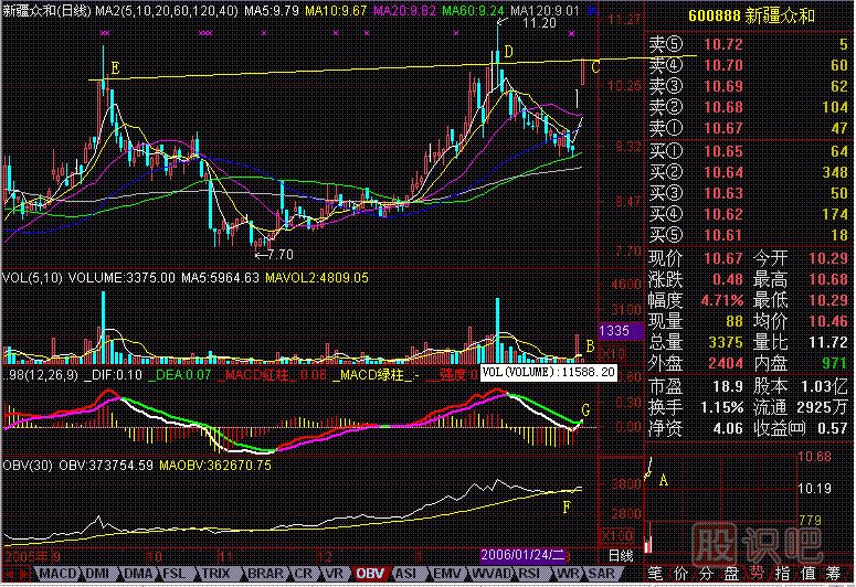 我們今天要講的就是巨量跳空,回檔買進。為什么呢?我認為在一個低迷市道下上市的新股,它的股價定位比較低,再加上主力能在三天內將這個股票90%、100%地換手,這也就是表明原始股民不多了,今后股價就是莊家說了算,就像今天這樣,它愛跳空高開幾個點就高開幾個點,而且今天跳空放出巨量,遇到這種情況,回檔就是買進的機會。我們平時講追漲,其實只能在這種情況下進行,也就是主力意圖相當明確,就是要股價漲起來,我們當然可以追漲;而對于那些走勢偏軟,主力意圖不明顯,即沒有跳空也不放巨量的股票,你去追它干什么啊?因此,我們得出一個結論:要做就要做巨量跳空,就要做新股且是市道低迷時上市的新股。符合這四個條件時,我們才能實施追漲。最后我再一次強調,希望大家能將巨量跳空,回檔買進八個大字,牢牢記心頭。