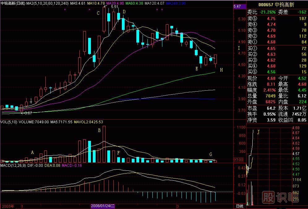 大死爪圖252-1今天000592ST昌源終于跌停板了(圖252-1)。這只個股最致命處是大死爪圖形,從D點開始,20、60和120日平均線呈“爪&rd...