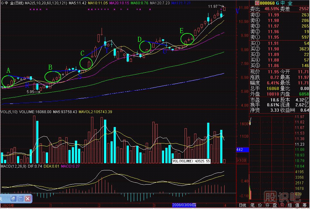 6字買賣法圖247-16字買賣法操作要領:1、當K線爬到五條均線(均線參數(shù):5、10、20、60、120)之上時,畫一個圓圈圈住這根K線,作買入操作。2、以...