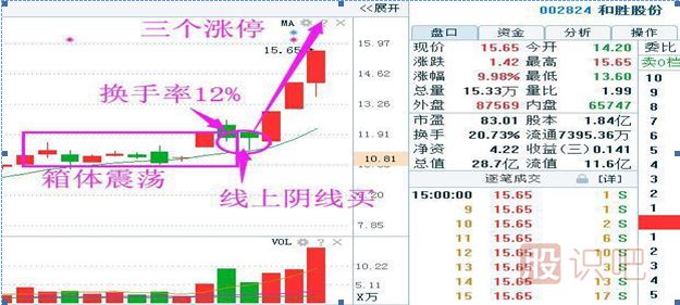 再來看上圖的和勝股份,就是通過箱體突破戰(zhàn)法選出來的,在3月19日換手率達到12%以上,股價突破箱體,,量能也是上漲放量,下跌縮量,資金持續(xù)的在流入,果斷的選出來,之后連續(xù)的三上漲停。