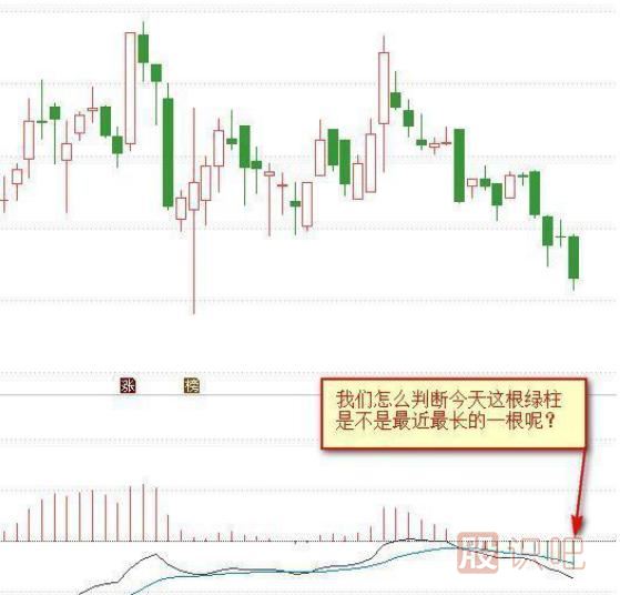 當(dāng)價格下跌,MACD綠柱逐步放大,當(dāng)綠柱出現(xiàn)最高點(diǎn)時買進(jìn)。問題是我們該如何判斷當(dāng)日MAD綠柱是不是最長的那一根呢?因?yàn)榫G柱的數(shù)量是不固定的,是可以一直連續(xù)的放大的。