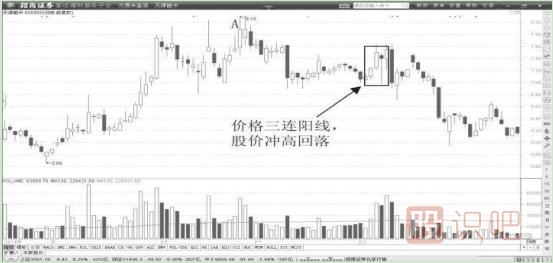 【要點2】:圖中股價下跌途中,反彈走勢出現(xiàn)了三連陽線的形態(tài)。股價反彈空間有限,我們可以考慮半倉資金投入來控制超短線交易的持股風險。當然,也可以用稍微多一些的資金建倉,這都取決于我們能夠承受的風險和價格下跌的趨勢。