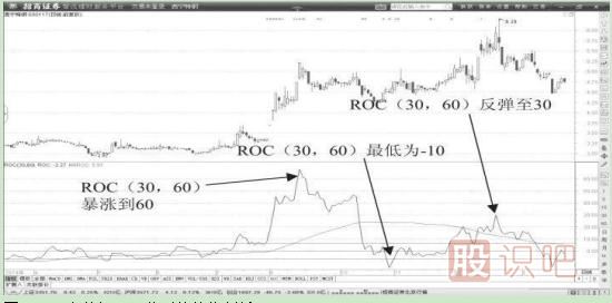 【要點1】:圖5-5顯示,當ROC指標高達60的時候,我們可以看出,之前該股表現(xiàn)非常強勢。指標高達60表明股價一月漲幅高達60%。這個時候我們只有更多的操作完成超短線交易,才可能獲得更高的回報。