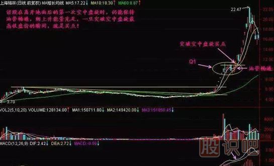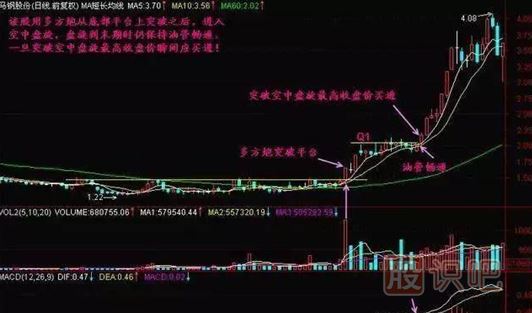 1、該股在離開地面后的第一次空中盤旋時(shí),仍能保持油管暢通,則上升能量充足,一旦突破空中盤旋最高收盤價(jià)的瞬間,就是買點(diǎn)。