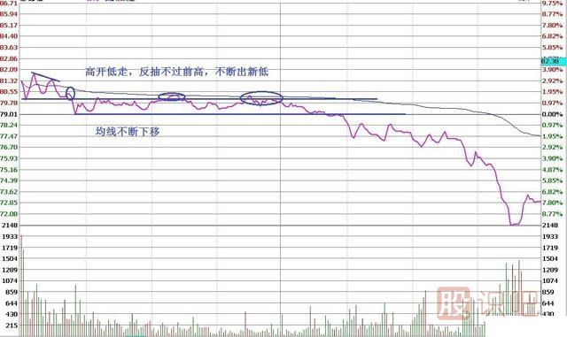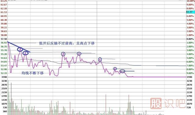 低開后反抽不過前高且高點下移,均線跟下