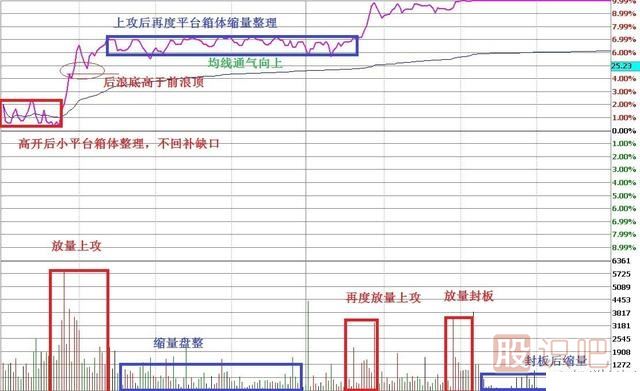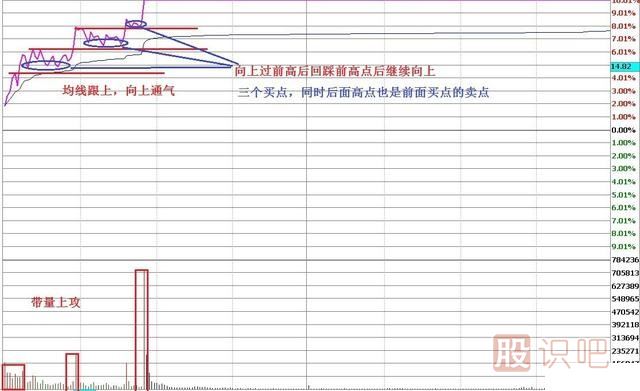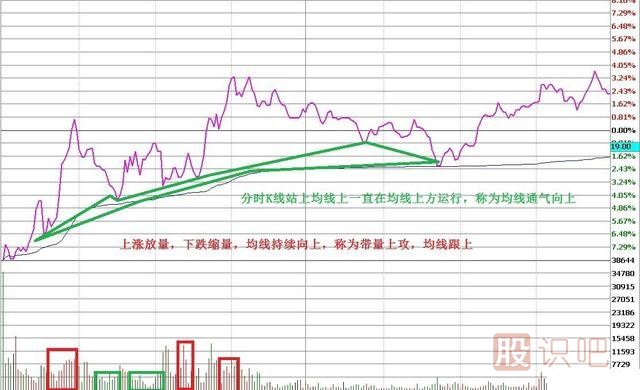 高開后高走,均線向上通氣,后浪底高于前浪頂,均線跟上(帶量上攻)