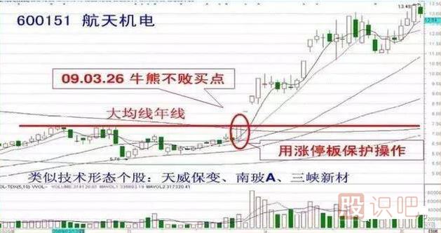 個股放量漲停沖擊大均線年線,構(gòu)成短線追漲買點,短線高手可在漲停直接追漲,是必勝的K線形態(tài),稱之為“牛熊不敗”。