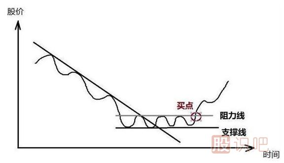 2、當(dāng)一個(gè)股票在下跌趨勢中,完成一次的震蕩之后,拒絕新低的出現(xiàn),并再次向上(而被突破)時(shí),此時(shí)意味著空頭力量衰減,市場暫時(shí)均衡,但此時(shí)并不需要急于買入,以防震蕩后繼續(xù)重歸下跌趨勢