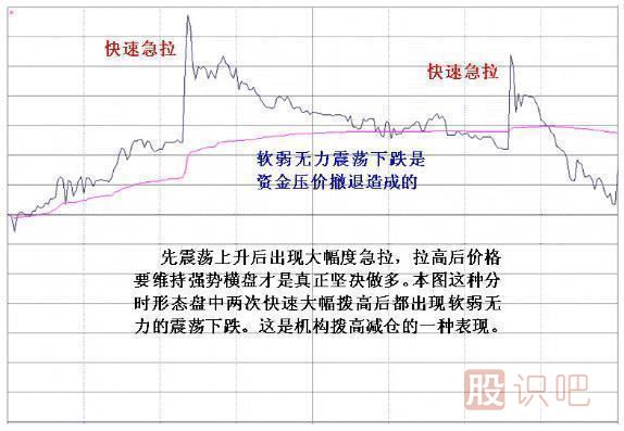 莊家利用股價(jià)全天劇烈震蕩,吸引散戶進(jìn)場。當(dāng)股價(jià)強(qiáng)勢上揚(yáng)時(shí),散戶以為股價(jià)還將拉升,追漲進(jìn)場;當(dāng)股價(jià)下降非常多時(shí),散戶以為底部到來,爭相“抄底”,此類走勢,大概率是大資金出逃。