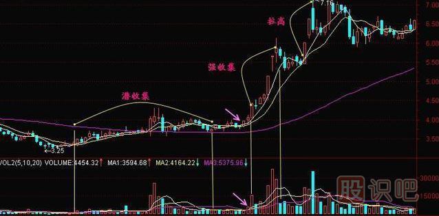 拉 高吸籌也是主力常用的吸籌方法。主力先在股價(jià)平穩(wěn)期開始漫長的籌碼收集過程,可被看做是潛收集。到了某個(gè)時(shí)候,主力覺得時(shí)機(jī)成熟了,開始大量買進(jìn)籌碼,使股價(jià)快速上升,這時(shí)的K線圖上出現(xiàn)連續(xù)的陽線,此階段可被看做強(qiáng)收集階段;強(qiáng)收集階段結(jié)束后,主力有時(shí)會(huì)進(jìn)行震倉洗籌,使很多獲利盤吐出,有時(shí)則直接進(jìn)入拉高階段。