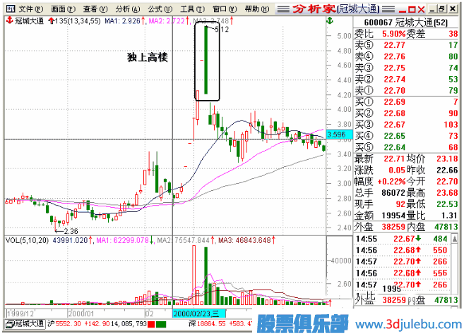 股價(jià)經(jīng)過(guò)大幅揚(yáng)升后,突然在某一天,股價(jià)跳空高開(kāi),以漲停板開(kāi)盤(pán)居多,然后逐波回落,主動(dòng)性拋盤(pán)明顯增多,表明主力去意已決,盤(pán)中若漲時(shí)縮量,跌時(shí)增量,更是見(jiàn)頂信號(hào),許多個(gè)股出現(xiàn)高位巨量陰線,十之八九會(huì)開(kāi)形成大頭部,我們把這根高位巨量陰線稱之為“獨(dú)上高樓”。