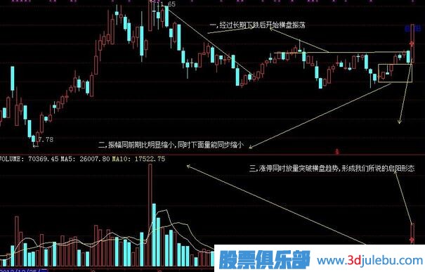 三,漲停同時放量突破橫盤趨勢,形成我們所說的啟陽形態(tài)