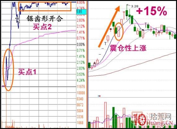 從盤口上說,該股在當天以跌停板開盤,但在十分鐘后就被巨量買盤打開了跌停,這時就形成了第一個買點(見左半圖中的圓圈所示)。緊接著,分時圖走出了一個大型N字型之后,便以一個尖角長波直沖漲停板。由于獲利盤較多,在漲停板處遭到了拋壓,打開了漲停板。但是從成交量上看,這種拋壓并不嚴重。有意思的是,主力并沒有急于用巨量買單去封死漲停板,而是讓市場的買盤來對付這些拋盤,來一個借勢洗盤。于是便在漲停板處出現(xiàn)了一段鋸齒形的開合波,這種開合波就形成了第二個買點。