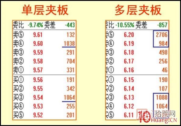 夾板式大單掛單是主力在委買欄和委賣欄中,分別在某一個價位掛出大單,使買賣盤上顯示出一種上有“天花板”,下有“硬地板”的夾板式掛單格局。