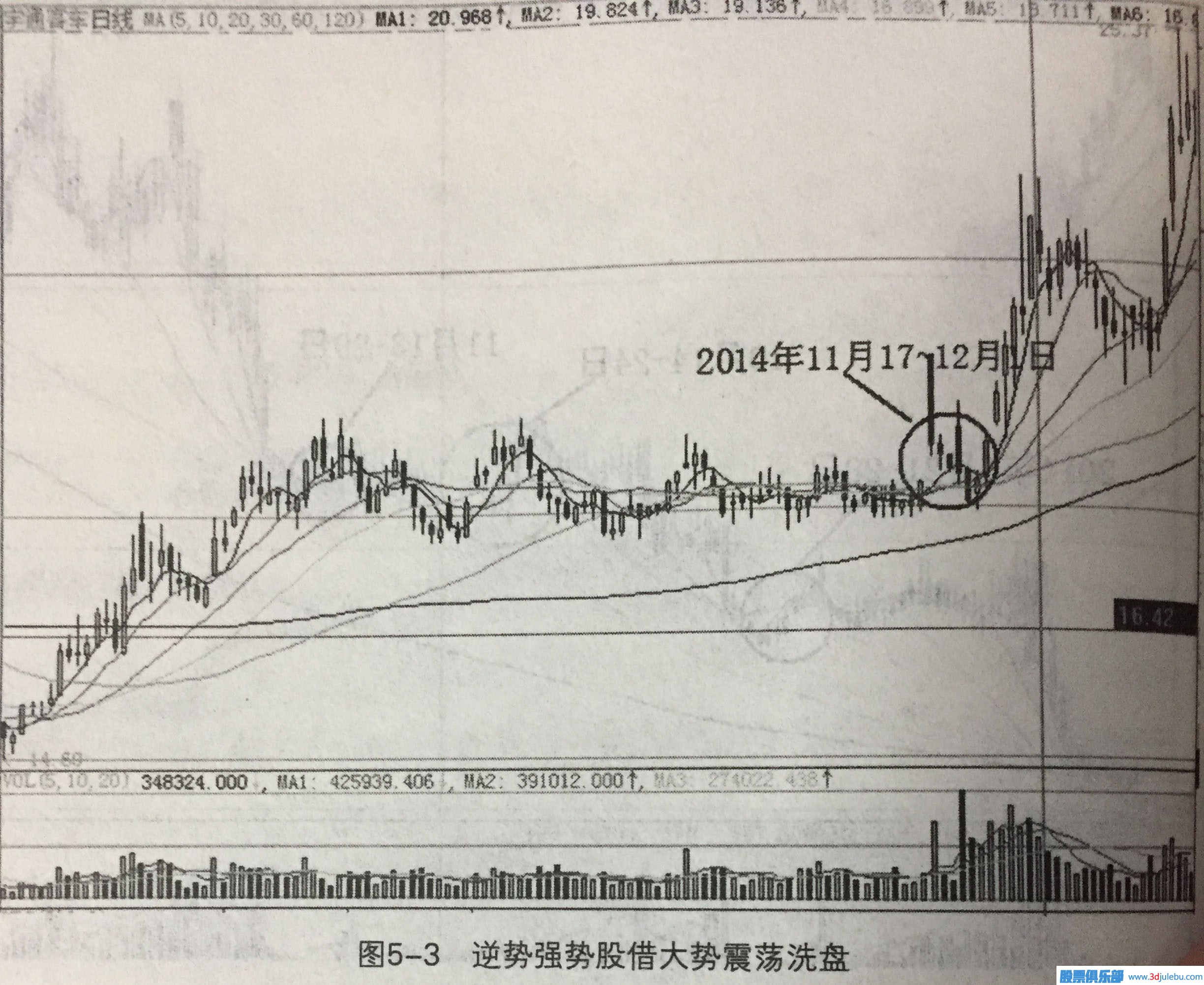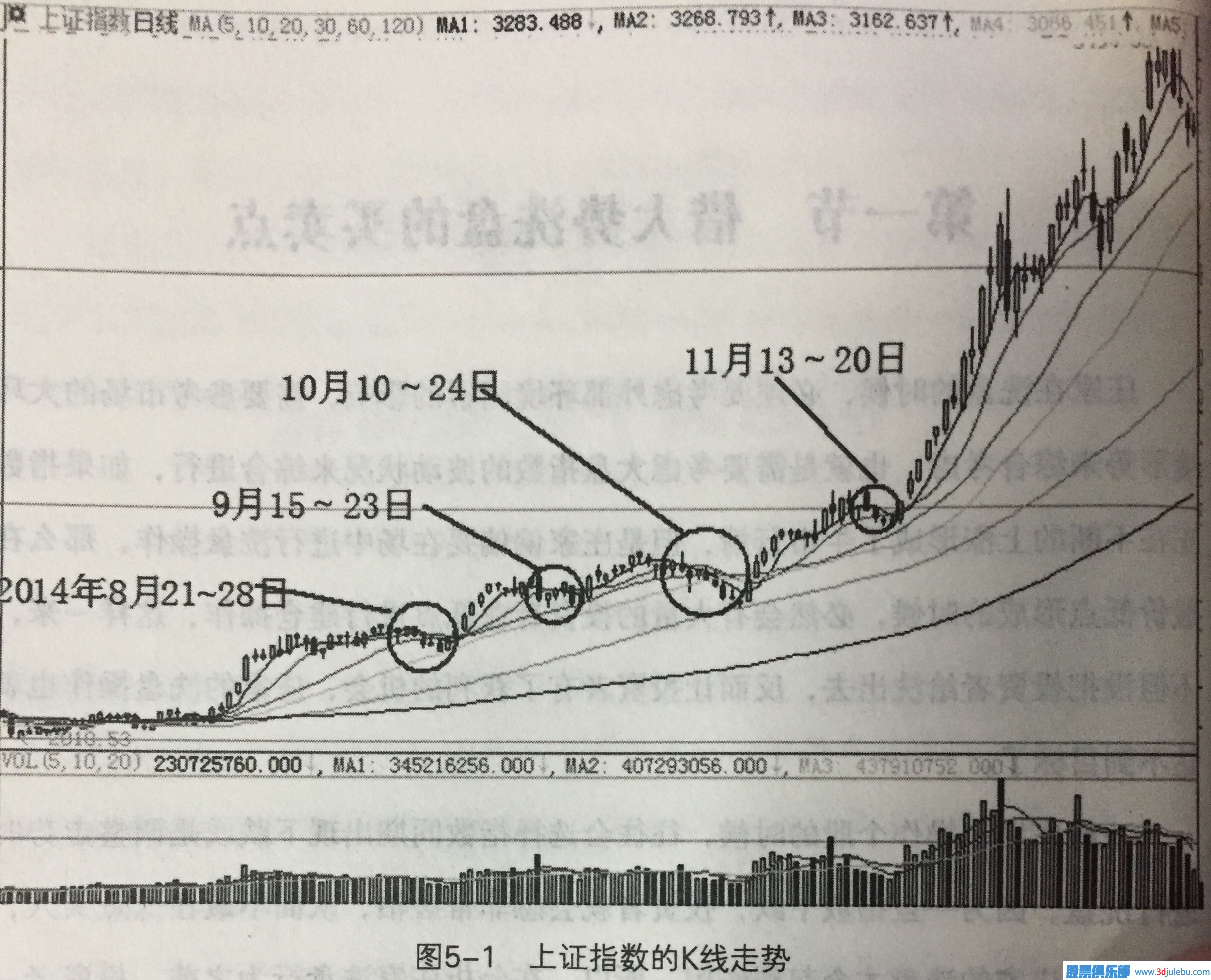圖5-1是上證指數(shù)2014年8月以來的K線走勢(shì),在大盤突破2000點(diǎn)這個(gè)平臺(tái)后,大盤出現(xiàn)連續(xù)調(diào)整,先后跌破20日線、30日線,5日線與10日線形成死叉,圖形形態(tài)非常難看,技術(shù)形態(tài)上似乎已經(jīng)形成了向下的破位。但我們仔細(xì)分析可以看出,在指數(shù)調(diào)整時(shí)候,成交量出現(xiàn)了萎縮的跡象,這種量能變化說明資金并沒有在盤中進(jìn)行出貨操作,如果是資金在出貨成交量怎么可能不放大呢?所以,從量能上來看指數(shù)并未見頂,指數(shù)未見頂也就意味著盤中的絕大多數(shù)個(gè)股也沒有形成頂部。所以在這個(gè)時(shí)間段內(nèi),只要個(gè)股出現(xiàn)了下跌的走勢(shì), 那就意味著莊家正進(jìn)行洗盤操作的可能性較大。從隨后的上證指數(shù)走勢(shì)中, 我們就可以驗(yàn)證到了這一點(diǎn),隨后的幾個(gè)月指數(shù)一路上揚(yáng),漲勢(shì)喜人。