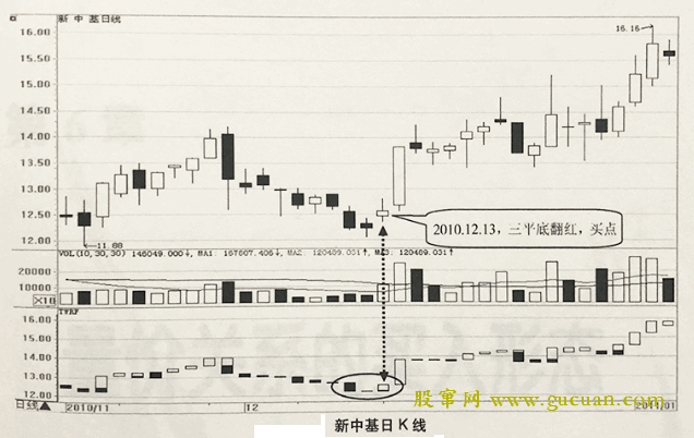 如圖所示,2010年12月9日至13日,新中基(000972)的股價經(jīng)過一段時間下跌后,其寶塔線指標完成了三平底翻紅的形態(tài)。這個形態(tài)說明市場上的空方力量逐漸減弱,多方力量增強。12月13日,該形態(tài)最后一根寶塔線的上方變成紅色,買點出現(xiàn)。
