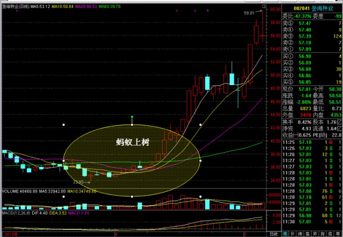 是指股價低位企穩(wěn),依托5日均線,以連續(xù)小陽線緩步攀升,其成交量保持在相對溫和的狀態(tài),會放出間歇量。特別是在盤勢回調(diào)時仍可保持同一節(jié)奏,就像螞蟻雄兵在不斷前進一樣。但這時候不是最佳的買點,而是在出現(xiàn)回調(diào),下破5日線,在10日線附近獲得支撐并收下影陰線的時候,考慮介入。因為隨后兩天往往會以陽線向上攻擊,創(chuàng)出新高。