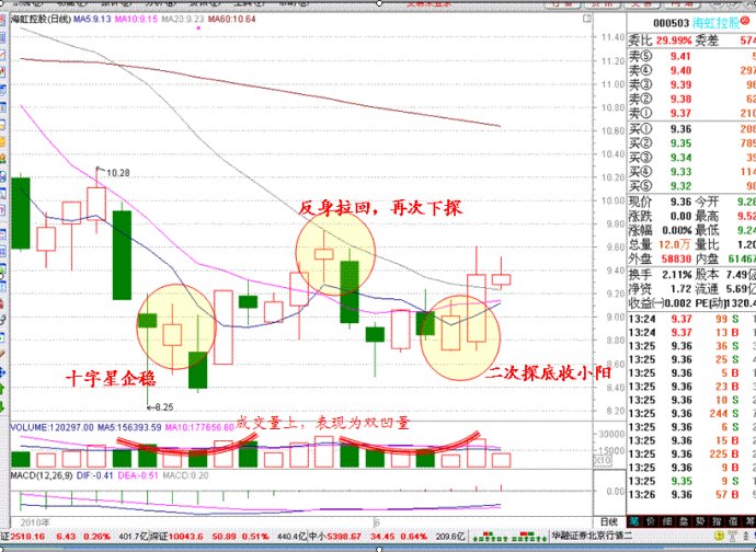 股價連續(xù)下跌之后先以十字星企穩(wěn),沿著5日線緩慢爬升,期間會夾雜著小陰,但整體重心不斷上移,5日線首次上穿10日線,到達一定高度后,反身拉回,再次下探,往往陰線實體會逐步加長
