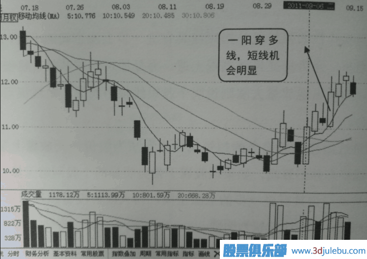 如圖2所示,該股在9月6日當(dāng)天出現(xiàn)放量一陽(yáng)穿多線的特征,說(shuō)明短線機(jī)會(huì)明顯,當(dāng)天尾盤可伺機(jī)跟進(jìn)。結(jié)果該股在9月6日之后股價(jià)進(jìn)一步上漲,且上漲幅度不小,如果跟進(jìn)短線收益理應(yīng)不菲。