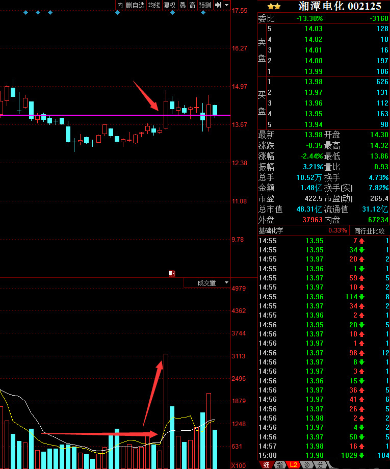 如果具備以上條件說(shuō)明,大陽(yáng)線的當(dāng)天是主力的主要成本區(qū),而且在高位放量,證明主力成本較高。那么我們可以大概在集中放量的價(jià)位畫一個(gè)線,如示例圖的紫色線,這根線就是主力的成本線。一般操盤手不怎么喜歡自己賬面浮虧,所以一般會(huì)在收盤前把價(jià)位拉回去。