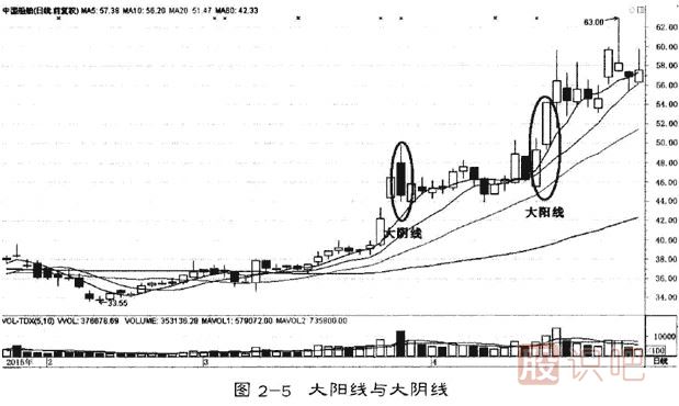 大陽(yáng)線與大陰線的K線實(shí)體較中陽(yáng)線與中陰線更長(zhǎng)。較低價(jià)開盤后一路上升,并以全天較高價(jià)收盤,就可以有較短的上下影線存在,但在整體感覺(jué)上其較短的上下影線可忽略,陽(yáng)線實(shí)體巨大,稱為大陽(yáng)線(圖2一5)
