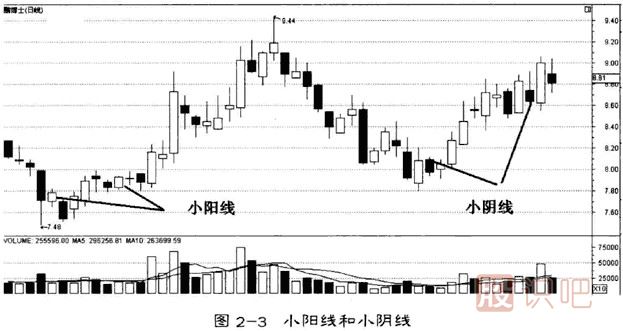 小陽(yáng)線與小陰線是指開盤價(jià)與收盤價(jià)相差不大,K線實(shí)體比較短,并帶有較短的上下影線,沒(méi)有上下影線的稱為光頭光腳小陽(yáng)線與光頭光腳小陰線。