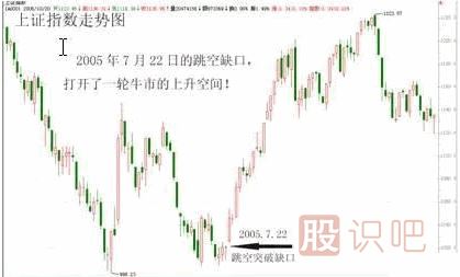 例如,2005年7月22日,上證指數(shù)以1026點跳空高開,并且當天大漲2.52%,迅速脫離1000點這個“危險”的整數(shù)關(guān)口,其后一輪轟轟烈烈的大牛市就此展開。如圖: