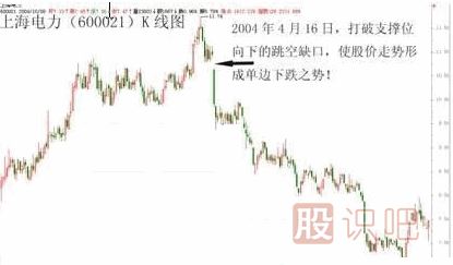 再如,上海電力(600021)這只個股在2003年10月29日上市后,一路震蕩上揚,走勢極為穩(wěn)健,但在2004年4月16日這天,突然間大幅跳空低開,留下了一個向下的突破缺口,使前期連續(xù)五個交易日的7.80元附近的支撐位立刻變成阻力位,而在7.80元附近買進的投資者根本來不及反應(yīng),便已被深套。此后,該股股價一路單邊下跌,一直到跌破上市當天的最低價。(見下圖)