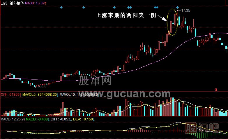 如圖5所示,維科精華(600152)在30日均線上方莊家以大角度不斷拉升股價,從股價突破30日均線算起,股價已經(jīng)翻番。在兩陽夾一陰K線組合出現(xiàn)后該股并沒有延續(xù)強勢,反而開始走弱,由此可見,該股在