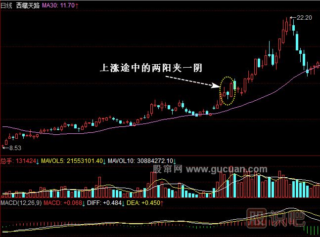 兩陽夾一陰又稱多方炮,由=根K線組成,第一根K線和第三根K線為陽線,第二根K線為陰線,就是一根小陰線夾在兩根陽線中間。在標準的兩陽夾一陰中,其中陰線的實體全部都被前后兩根陽線的實體所覆蓋掉,這三根K線都可以帶有上下影線。