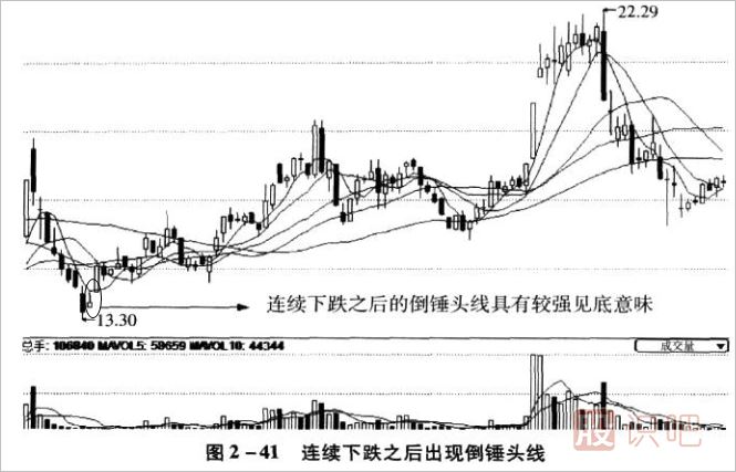 倒錘頭線見底信號與上影線的長短相關(guān),通常上影線越長,說明多方上攻的意愿越強,股價見底的可能性則相對更大些。同時倒錘頭線也有陽線陰線的區(qū)別(如圖2-39所示,前一個為陽倒錘頭線,后一個為陰倒錘頭線),陽倒錘頭線的見底可信度更高。