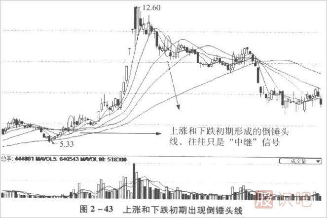 4.倒錘頭線出現(xiàn)在上漲或下跌的初期,往往只是上漲或下跌中繼信號。