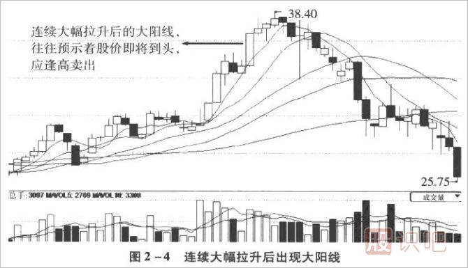 如果股價(jià)在連續(xù)大幅上揚(yáng)之后收出大陽(yáng)線(xiàn),則不能單純地預(yù)測(cè)股價(jià)將上揚(yáng),因?yàn)?a href=http://m.nbyzcy.com/GPRM/zs/3692.html target=_blank class=infotextkey>主力需要出貨的時(shí)候往往會(huì)做出好看的圖形,此時(shí)股價(jià)見(jiàn)頂回落的概率較大,投資者不可盲目追高,持有者應(yīng)當(dāng)進(jìn)行減倉(cāng)操作。如圖2-4所示