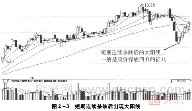 如果在股價(jià)連續(xù)下跌之后出現(xiàn)大陽(yáng)線(xiàn),則表明多方將組織反攻,買(mǎi)方從下方向上掃貨,空方由于連續(xù)殺跌,失去了繼續(xù)做空的動(dòng)能,因此,股價(jià)將見(jiàn)底回升,逐步走高,此時(shí)投資者可適當(dāng)進(jìn)行抄底。如圖2-3所示