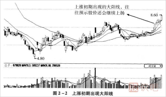 光頭光腳陽(yáng)線(xiàn)出現(xiàn)后,股價(jià)不一定繼續(xù)上漲,需要看這一K線(xiàn)出現(xiàn)在股價(jià)運(yùn)行的哪個(gè)區(qū)域。根據(jù)筆者長(zhǎng)期的經(jīng)驗(yàn)判斷,如果股價(jià)在上漲初期出現(xiàn)大陽(yáng)線(xiàn),表明多頭力量強(qiáng)勁,股價(jià)仍會(huì)繼續(xù)上揚(yáng),投資者應(yīng)以持有為主,甚至可進(jìn)行適當(dāng)加倉(cāng)操作,如圖2-2所示。