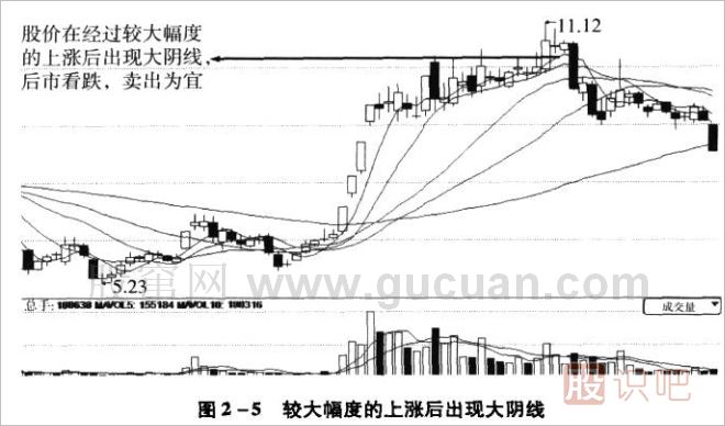光頭光腳大陰線(xiàn)出現(xiàn)之后股價(jià)不一定繼續(xù)下跌,需要看這一K線(xiàn)出現(xiàn)在股價(jià)運(yùn)行的哪個(gè)區(qū)域。如果光頭光腳陰線(xiàn)出現(xiàn)在股價(jià)上漲一段時(shí)間之后,往往是空方開(kāi)始反擊的時(shí)候,投資者最好進(jìn)行減倉(cāng)操作。如圖2-5所示