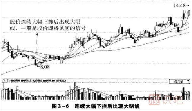 如果大陰線(xiàn)出現(xiàn)在股價(jià)連續(xù)大幅下跌之后,則往往是空方力量衰竭的表現(xiàn),此時(shí)投資就不宜跟風(fēng)殺跌,而應(yīng)該敢于逢低買(mǎi)入。但由于股票趨勢(shì)短期難以扭轉(zhuǎn),此操作方法只適宜短線(xiàn)操作,獲利就拋,否則可能先賺后賠再次被套。如圖2-6所示